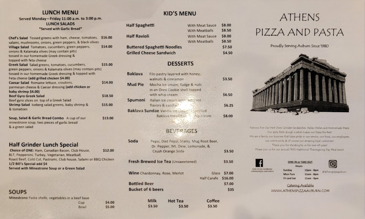 The inviting atmosphere at Athens Pizza & Pasta enhances the dining experience, making every visit feel like a family gathering. With friendly owners who often share the restaurant’s rich history, it's easy to see why so many return time and again. If you’re in Auburn, don’t miss the chance to savor a slice of their charm!